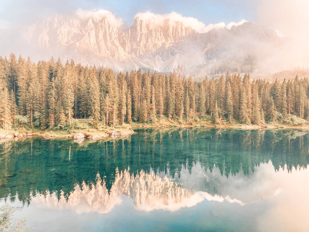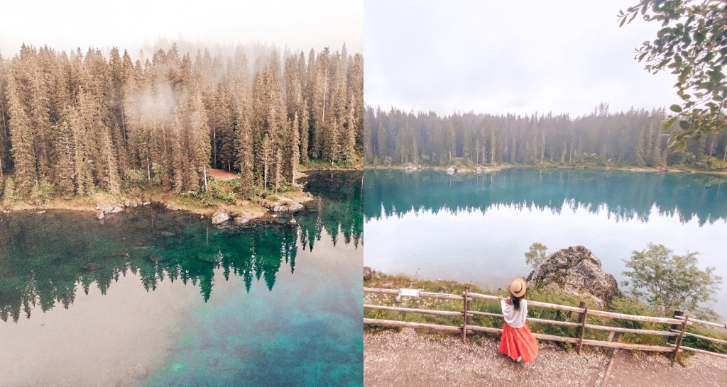 Lago di Carezza is another dazzling, super famous lake you should visit in the Dolomites. First thing you’ll notice is how calm it is and the amazing dark green colouring the waters and the beautiful mountain panorama in the background, creating a spectacular reflection in the lake. The entire lake is surrounded by a fence making it pretty obvious that is prohibited to swim in the lake! You’ll see many advertisements all around telling you not to swim.