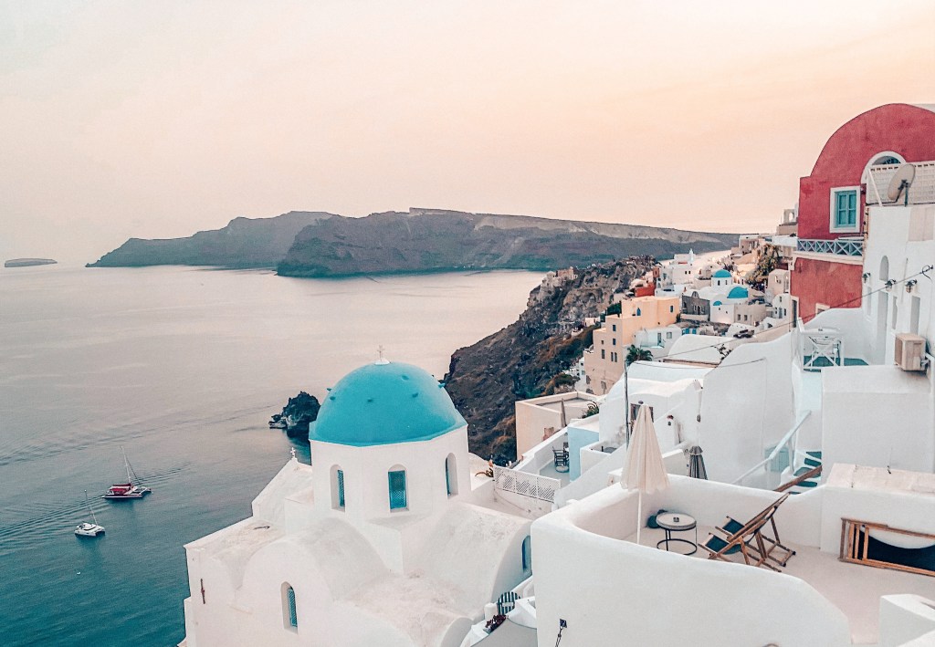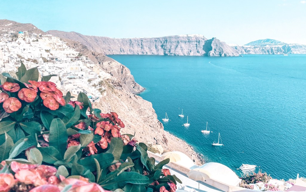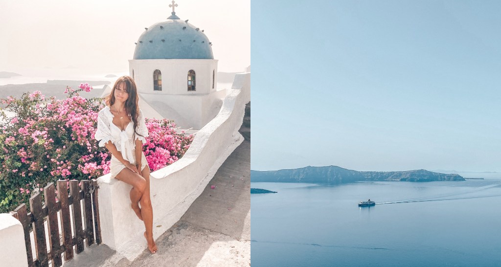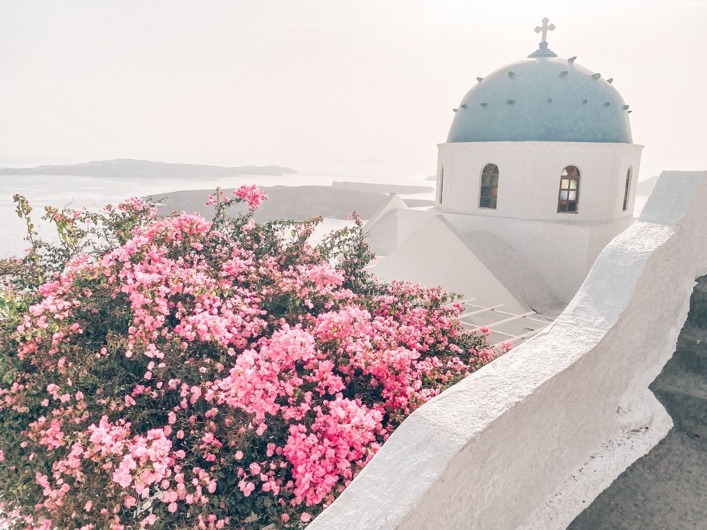 Imerovigli is very small, spending one hour is more than enough to see all the great spots. There are not restaurants, but you can find many hotels instead, so this place is great to have a nice walk and nothing else. There is a dreamy spot with a church and the famous pinky flowers that we see all over in Greece, here you can enjoy magnificent views of the famous volcano, the deep blue sparkling Aegean Sea and other Santorini villages.