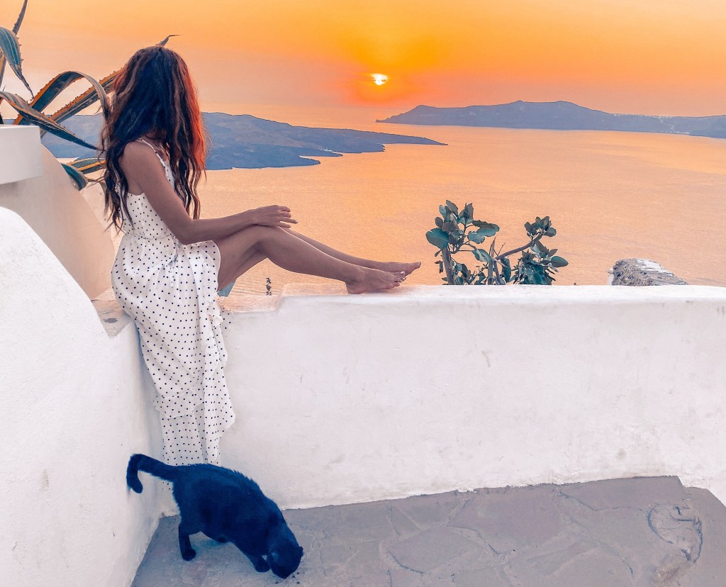 We came two nights in a row to watch the sunset in Fira but also to spend time with our new friend, a cute black cat we found when we were walking around Fira. She was there each time we came back, in the same place. How cute is that! In Fira we could find a place without crowds to enjoy the sunset, actually there was just the two of us and the cat. The stillness, the silence watching the sun dipping over the horizon, the colours played by the sky.. it gave me chills (good ones) and a nice warm feeling inside. It was simply magical!