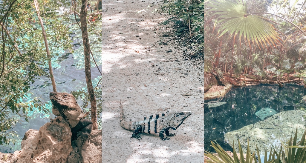 When we arrived here, there was nobody but us, so we could enjoy all the cenote for a good while. We are pretty lucky, because this is a popular one. This was our first cenote to visit and it was not hard to be impressed by the waters surrounded by lush tropical vegetation, with many trees under you can rest. It was super fun to walk around because we meet with iguanas and we spotted many cute birds.