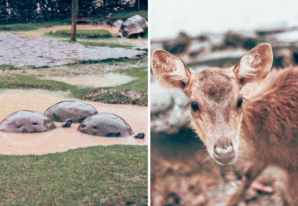 Right at the beginning of the park is a little place where you can meet the giant tortoises and deer. Because it was raining I got the opportunity to take this cute photo of them with the heads out of the water. The deer where bathing in the small river created by the rain. Overall, to be complete honest I don’t like caged animals (the space was not super small, but they are not in the wild), but sadly sometimes to protect them they must stay inside.