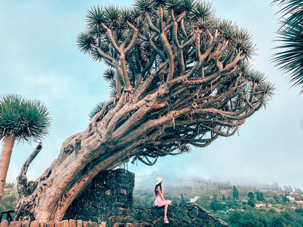 One of the trees that most caught me the attention is of course the Dragon tree. We found this awesome spot with cute cactus gardens, an impressive view of the island and this huge dragon trees. It is not far away from the road, actually it is very easy to access this gorgeous garden. There are actually two separate dragon trees and both of them are somewhat crooked. Definitely some of my favorite hidden gems in La Palma!