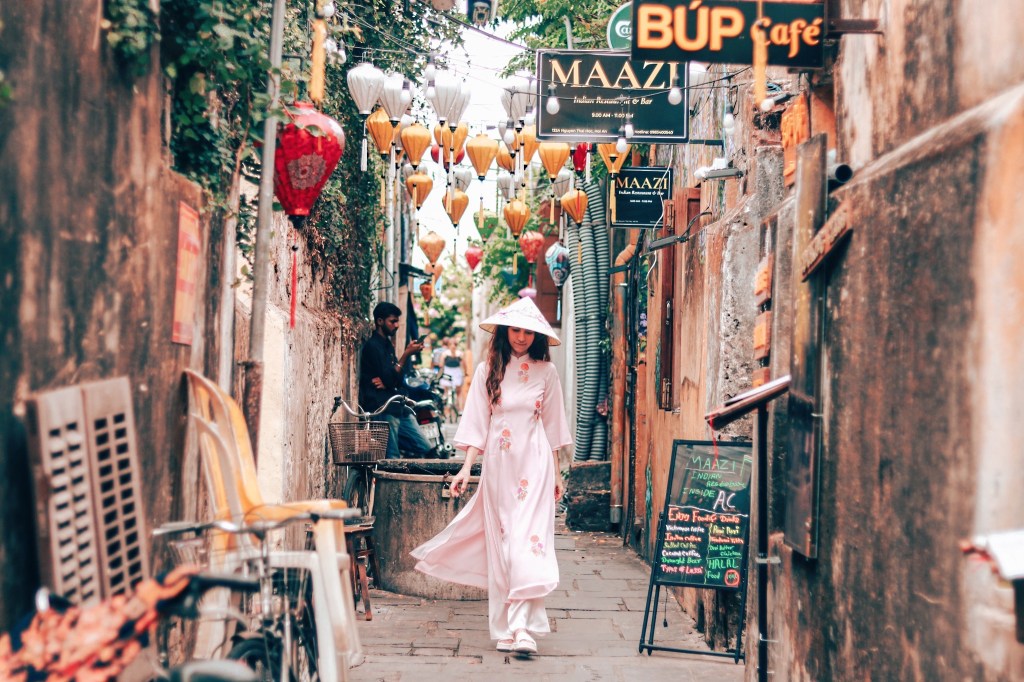 The streets in Hoi An are lined with beautiful houses, secret gardens, colourful and beautifully decorated temples, lovely bars, pink hanging flowers, its lively but calm atmosphere definitely feels a world away from cities like Hanoi or Ho Chi Minh. It can still get very busy, however. Meanwhile, the honking motorbikes and yelling market salesmen catapult you back in modern day Vietnam with a snap of the fingers.
