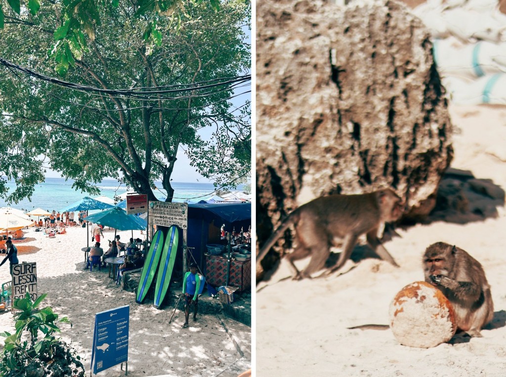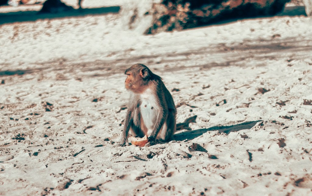 Ohh yes.. this is a beach full of monkeys doing monkey stuff.. But somehow the day I visited, they were on their best behaviour, no sunglasses stolen, no chasing people for food, no stealing. Justโฆ monkeys. Maybe it was their off day. However, I did spot some monkeys exploring some scooters in the parking lot, or eating coco from the coconuts who travellers left on the beach. I loved being at the beach among monkeys, actually I would have preferred just monkeys and no people, but I guess things are not always the way we want.