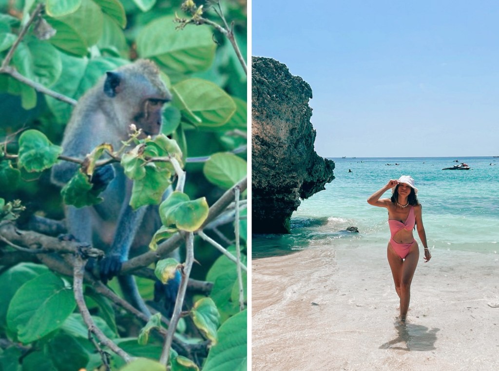 The cliffs are really are dramatic with very turquoise waters and when the sun hits right, itโs genuinely wow. The beach has impressive limestone cliffs with lush greenery and many naughty monkeys, which makes this beach unique. In other words, this beach stands out a lot and it is not only a great place to sit out and relax but are great spots to take great pictures too.